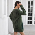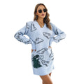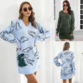 Cute Dinosaur Cartoon Jacquard V-neck Long Sleeve Sweater Dress Women's Loose Knitted Dress Autumn And Winter