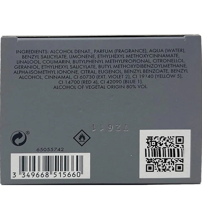 Alcohol Denat., Parfum (Fragrance), Aqua (Water), Benzyl Salicylate, Limonene, Ethylhexyl Methoxycinnamate, Linalool, Coumarin, Butylphenyl Methylpropional, Citronellol, Geraniol, Ethylhexyl Salicylate, Butyl Methoxybenzoylmethane, Alpha-Isomethyl Ionone,